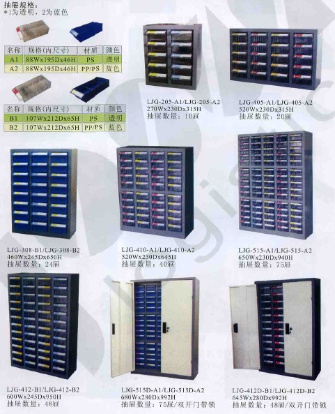 产品介绍: 适合工厂、办公室各种小型零件、样品、 模具、工具、电子元器件等储存分类使用 弹性空间运用,每屉附活动隔板两片, 可以随意调整屉内空间 彩色标示管理,抽屉可附彩色标示卡标明 屉内存放物品名称及规格,提高效率 防止滑落装置,防止抽屉拉出时, 物品零件不致掉落损坏