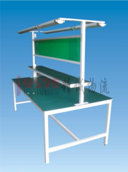 采用方管(30X30/40X40/40X60)桌架; 桌面采用25、30mm防护板; 配置调整脚垫、轻型吊柜、挂板、灯架; 承重小于500kg; 适合轻工电子组装等一般场合。